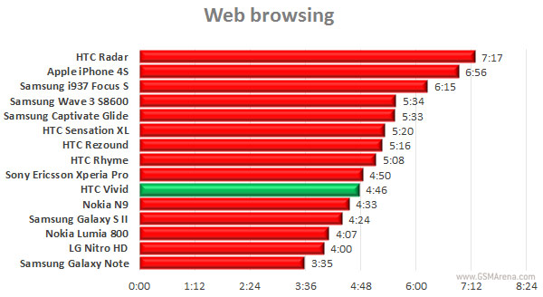 The Web-browsing time achieved by the device came in 4 hours and 46 minutes. This is a seriously commendable achievement given the massive 4.5 LCD screen of HTC vivid, as well as. It is better than Samsung Galaxy S II and LG Nitro HD.