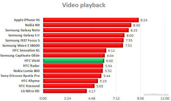 Video playback was also very impressive the Smartphone. HTC vivid managed 6 hours of playback on a single charge. This is solid in the face of the phone screen and low battery capacity one and the LTE significantly better result than the brothers and sisters, the LG Nitro HD.